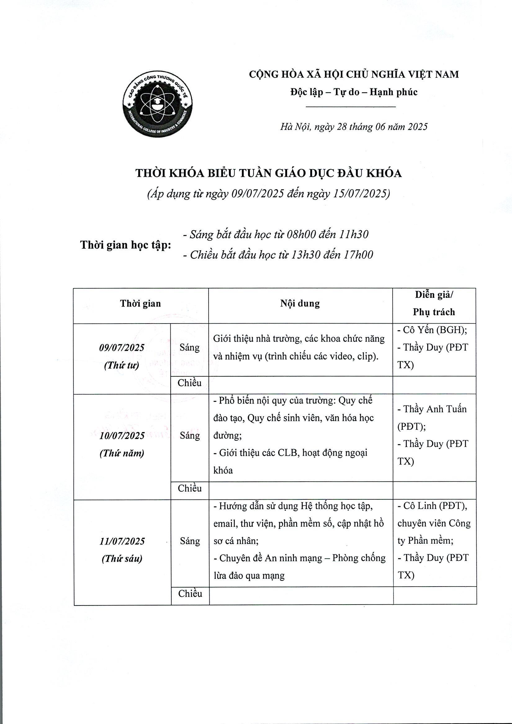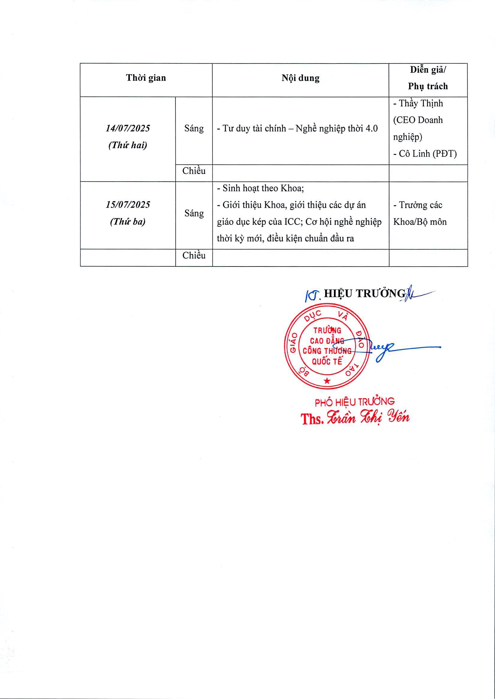Tuần giáo dục đầu khóa dành cho tân sinh viên ICC sẽ diễn ra trong 5 ngày từ 09/07 đến ngày 15/07/2025 tại phòng 305, tòa nhà Cao đẳng Công thương Quốc tế (44 Nguyễn Cơ Thạch, phường Mỹ Đình 2, quận Nam Từ Liêm, TP. Hà Nội). Trong khuôn khổ tuần lễ, các bạn được đào tạo bởi các thầy cô thuộc Ban giám hiệu, các thầy cô là Trưởng khoa bộ môn, chuyên gia từ doanh nghiệp…